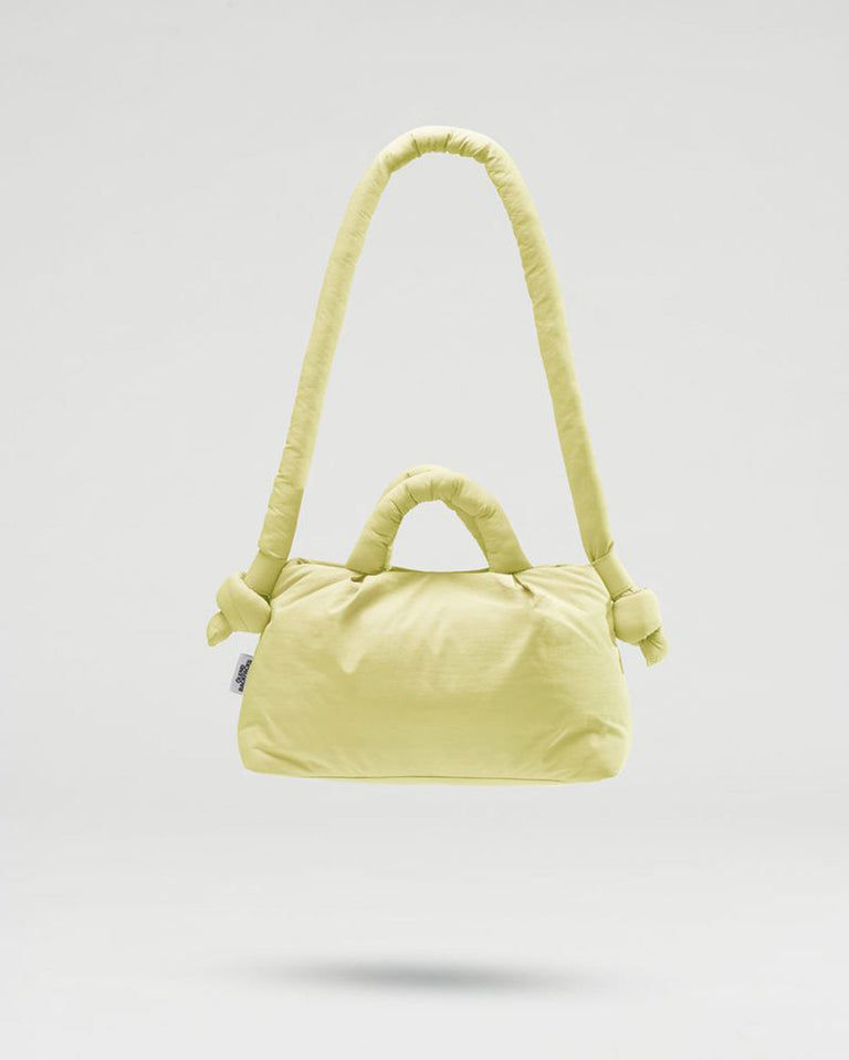 Lime Miniona soft bag from the Olënd brand. It is the small version of their Ona bag. Puffy and light, it's perfect for carrying your essentials.